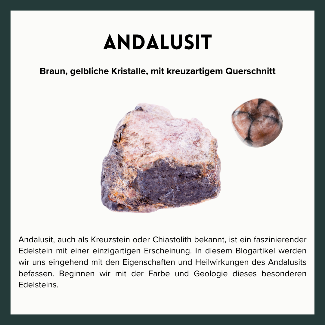 Andalusit, auch als Kreuzstein oder Chiastolith bekannt, ist ein faszinierender Edelstein mit einer einzigartigen Erscheinung. In diesem Blogartikel werden wir uns eingehend mit den Eigenschaften und Heilwirkungen des Andalusits befassen. Beginnen wir mit der Farbe und Geologie dieses besonderen Heilsteins.