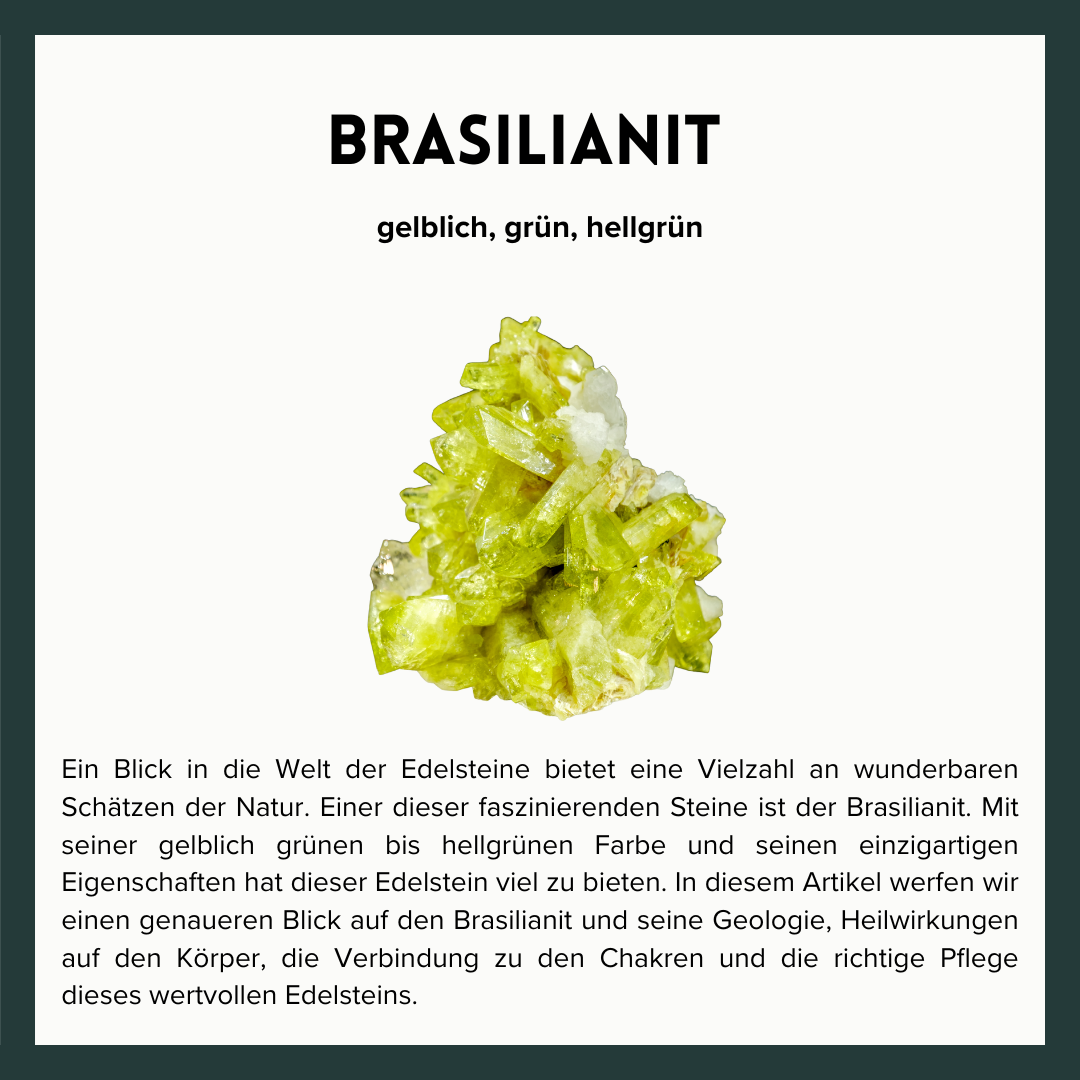 Ein Blick in die Welt der Edelsteine bietet eine Vielzahl an wunderbaren Schätzen der Natur. Einer dieser faszinierenden Steine ist der Brasilianit. Mit seiner gelblich grünen bis hellgrünen Farbe und seinen einzigartigen Eigenschaften hat dieser Edelstein viel zu bieten. In diesem Artikel werfen wir einen genaueren Blick auf den Brasilianit und seine Geologie, Heilwirkungen auf den Körper, die Verbindung zu den Chakren und die richtige Pflege dieses wertvollen Edelsteins.