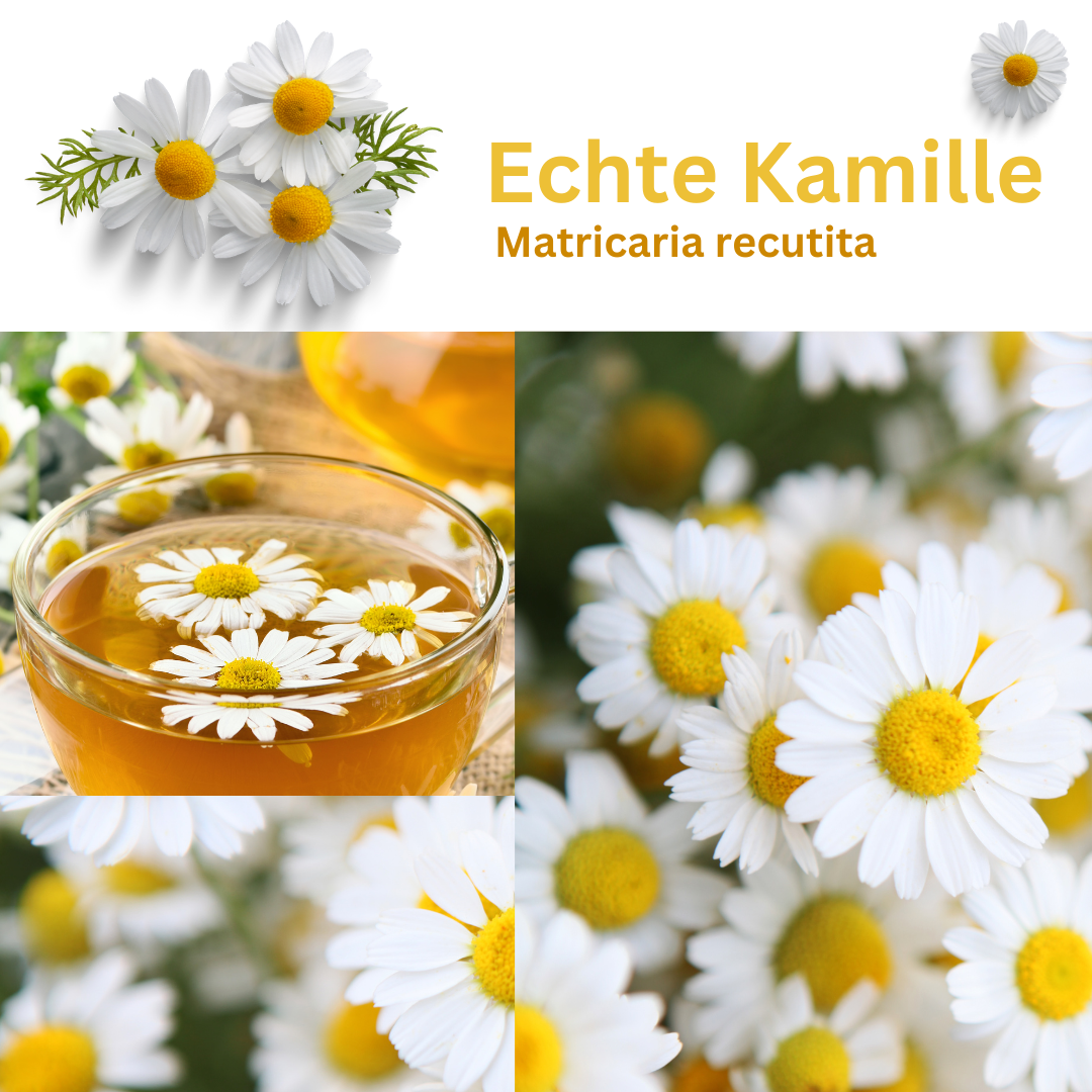 Die  Kamille findet in verschiedenen Formen Anwendung, sei es als Tee, ätherisches Öl oder in Hautpflegeprodukten. Ihre vielfältigen Anwendungen machen sie zu einer äußerst vielseitigen Pflanze in der Naturheilkunde.